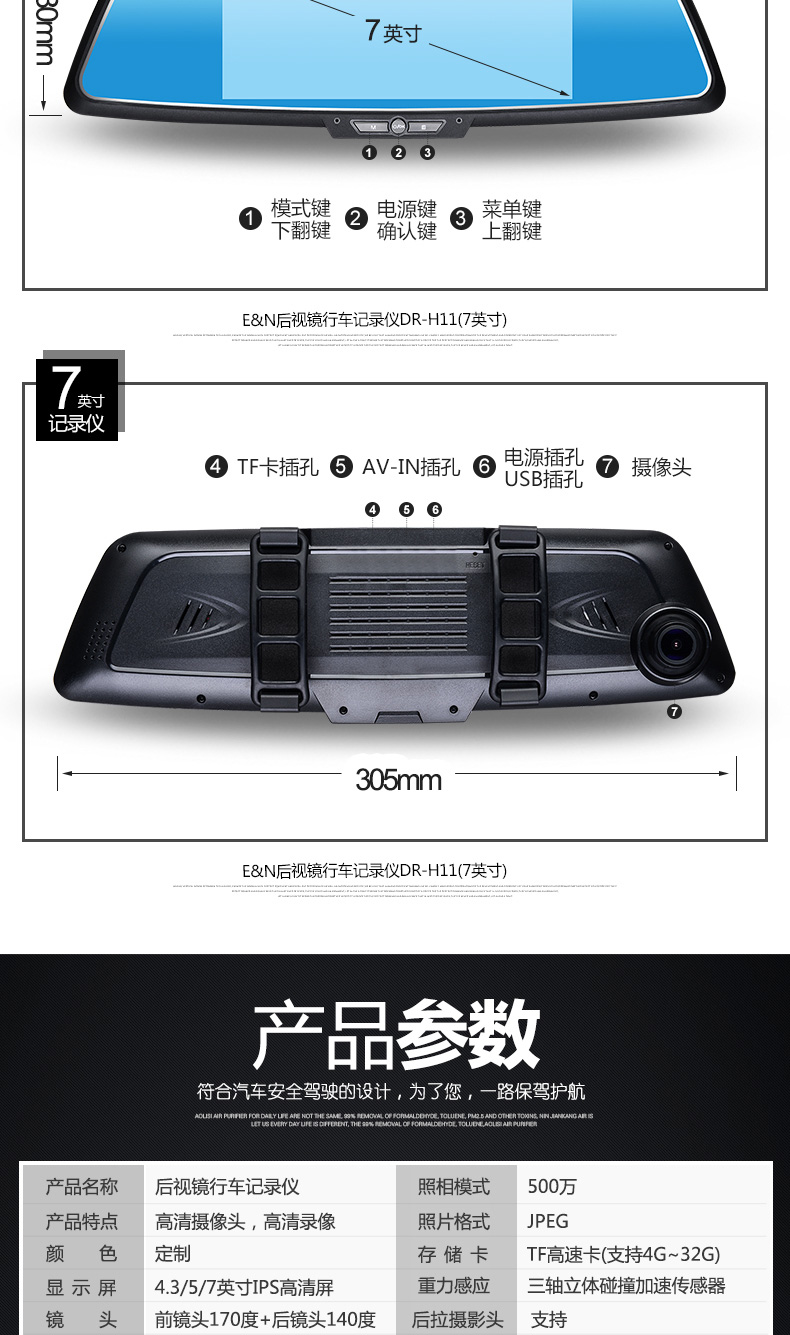 功能: 循環錄像、碰撞保護、停車監控、大屏觸控功能、手動鎖存、一鍵拍照