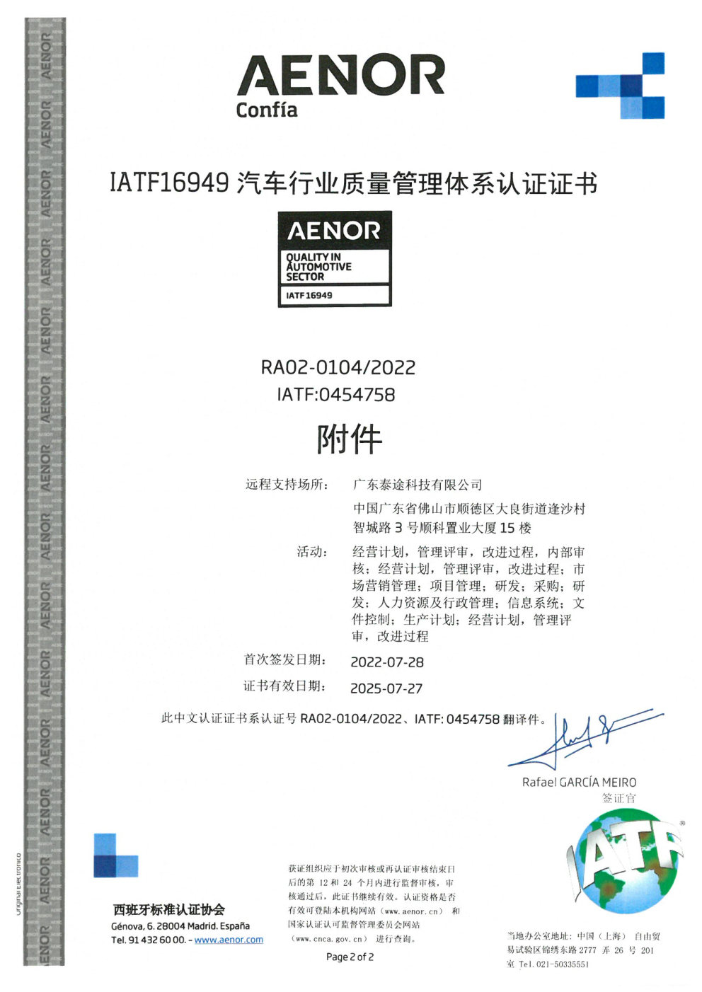 經(jīng)權(quán)威認(rèn)證機(jī)構(gòu)審核通過,我司廣東泰途科技有限公司再次順利通過了IATF16949:2016質(zhì)量管理體系認(rèn)證,并在2022年7月28日正式拿到該證書。通過該體系的認(rèn)證,表明我司在行車記錄儀和攝像頭模組的設(shè)計(jì)和制造全面符合IATF16949:2016汽車行業(yè)質(zhì)量管理體系的要求,取得IATF認(rèn)證標(biāo)志著我司的產(chǎn)品獲得了進(jìn)入汽車市場(chǎng)領(lǐng)域的準(zhǔn)入綠色通行證,對(duì)進(jìn)一步拓展汽車產(chǎn)品業(yè)務(wù)產(chǎn)生積極影響。